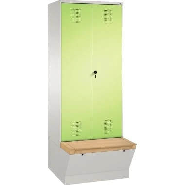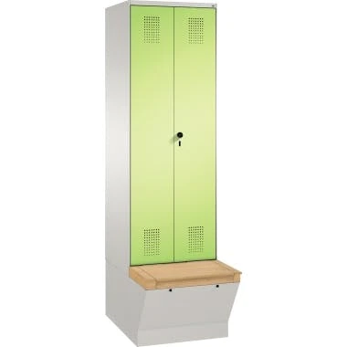 C+P Doppelspind 4905620S10053 Sitzbox 2Abteile B600mm lgr/vgn. Stahl-Garderobenschrank Evolo, als Straßen- und Berufskleidungsschrank, 2 Abteile für 1 Person. Türen zueinanderschlagend für gemeinsamen Verschluss. Korpus mit eleganten, schmalen Seiten für homogene Optik bei Reihenaufstellung. Geschlossene Seitenprofile mit ca. 54 Grad Innenschrägen für hohe Stabilität sowie für leichte Innenreinigung und komfortable Entnahme von Kleidung und Taschen. Innen 1 durchgehender Ablageboden mit hinteren Lüftungsfreiräumen und Aufkantung als praktische Abrollsicherung, darunter je Abteil 1 stabile Garderobenstange aus Ovalprofil mit 3 verdrehsicheren Schiebehaken. Sitz- und Aufbewahrungsbox zur optimalen Nutzung des Stauraumes, mit klappbarer Sitzfläche aus Buche-Massivholz (Verschlussklappe ist nur von Schrankinhaber zu öffnen) und verstellbaren Bodengleitern für einfachen Niveauausgleich. Ergonomischer Sicherheits-Drehriegel für Vorhangschloss. Stahltüren mit Anschlagsdämpfer und geschlossenen Seitenprofilen für höchste Stabilität und Einbruchsicherheit, mit reinigungsfreundlichem Belüftungslochbild und eingeprägtem Etikettenrahmen. Türaufhängung oben und unten in Drehbolzen.