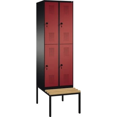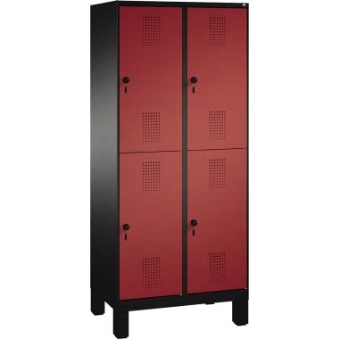 C+P Doppelstockspind 4931020S10081 Füße 4Fächer B600mm sgr/rrt. Doppelstöckiger Kleiderspind Evolo. Korpus mit eleganten, schmalen Seiten für homogene Optik bei Reihenaufstellung. Geschlossene Seitenprofile mit ca. 54 Grad Innenschrägen für hohe Stabilität sowie für leichte Innenreinigung und komfortable Entnahme von Kleidung und Taschen. Innen je Fach 1 stabile Garderobenstange aus Ovalprofil mit 3 verdrehsicheren Schiebehaken. Auf 150 mm hohen Füßen aus Kunststoff für optimalen Korrosionsschutz. Mit integrierter Niveauregulierung und Schutzhülsen zur stilvollen Abdeckung der Verstellschrauben, bequem von innen und außen verstellbar. Ergonomischer Sicherheits-Drehriegel für Vorhangschloss, Stahltüren mit Anschlagsdämpfer und geschlossenen Seitenprofilen für höchste Stabilität und Einbruchsicherheit. Mit reinigungsfreundlichem Belüftungslochbild und eingeprägtem Etikettenrahmen, Türaufhängung oben und unten in Drehbolzen.