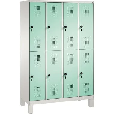 C+P Doppelstockspind 4931040S10080 Füße 8Fächer B1200mm lgr/lgn. Doppelstöckiger Kleiderspind Evolo. Korpus mit eleganten, schmalen Seiten für homogene Optik bei Reihenaufstellung. Geschlossene Seitenprofile mit ca. 54 Grad Innenschrägen für hohe Stabilität sowie für leichte Innenreinigung und komfortable Entnahme von Kleidung und Taschen. Innen je Fach 1 stabile Garderobenstange aus Ovalprofil mit 3 verdrehsicheren Schiebehaken. Auf 150 mm hohen Füßen aus Kunststoff für optimalen Korrosionsschutz. Mit integrierter Niveauregulierung und Schutzhülsen zur stilvollen Abdeckung der Verstellschrauben, bequem von innen und außen verstellbar. Ergonomischer Sicherheits-Drehriegel für Vorhangschloss, Stahltüren mit Anschlagsdämpfer und geschlossenen Seitenprofilen für höchste Stabilität und Einbruchsicherheit. Mit reinigungsfreundlichem Belüftungslochbild und eingeprägtem Etikettenrahmen, Türaufhängung oben und unten in Drehbolzen.
