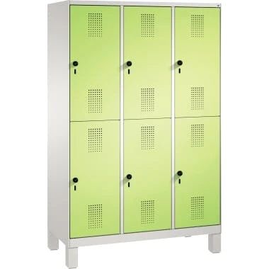 C+P Doppelstockspind 4932030S10036 Sockel 6Fächer lgr/vgn. Doppelstöckiger Kleiderspind Evolo. Korpus mit eleganten, schmalen Seiten für homogene Optik bei Reihenaufstellung. Geschlossene Seitenprofile mit ca. 54 Grad Innenschrägen für hohe Stabilität sowie für leichte Innenreinigung und komfortable Entnahme von Kleidung und Taschen. Innen je Fach 1 stabile Garderobenstange aus Ovalprofil mit 3 verdrehsicheren Schiebehaken. Auf 100 mm hohem Sockel. Mit integrierter Niveauregulierung und Schutzhülsen zur stilvollen Abdeckung der Verstellschrauben, bequem von innen und außen verstellbar. Ergonomischer Sicherheits-Drehriegel für Vorhangschloss, Stahltüren mit Anschlagsdämpfer und geschlossenen Seitenprofilen für höchste Stabilität und Einbruchsicherheit. Mit reinigungsfreundlichem Belüftungslochbild und eingeprägtem Etikettenrahmen, Türaufhängung oben und unten in Drehbolzen.