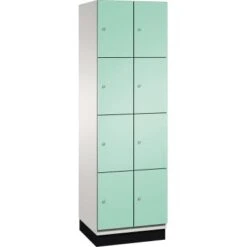 C+P Fächerschrank 4510320S10010 Sockel 8Fächer B600mm lgr/lgn. Korpus elektrolytisch verzinkt und lackiert in hochwertiger Einbrennbeschichtung. Geschlossene Seitenprofile mit ca. 54 Grad Innenschrägen für hohe Stabilität sowie für leichte Innenreinigung und komfortable Entnahme von Kleidung und Taschen. Stahltüren elektrolytisch verzinkt und lackiert in hochwertiger Einbrennbeschichtung, mit Anschlagsdämpfer und geschlossenen Seitenprofilen für höchste Stabilität und Einbruchsicherheit. Türaufhängung mit robusten Aluminium-Druckguss/Kunststoff-Scharnier. Auf 100 mm hohem Sockel mit integrierter Niveauregulierung, bequem von innen verstellbar, vorne zurückgesetzt.