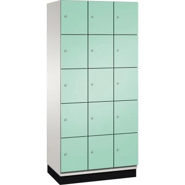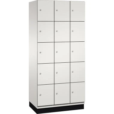 C+P Fächerschrank 4510430S10013 Sockel 15Fächer B900mm lgr/vgn. Korpus elektrolytisch verzinkt und lackiert in hochwertiger Einbrennbeschichtung. Geschlossene Seitenprofile mit ca. 54 Grad Innenschrägen für hohe Stabilität sowie für leichte Innenreinigung und komfortable Entnahme von Kleidung und Taschen. Stahltüren elektrolytisch verzinkt und lackiert in hochwertiger Einbrennbeschichtung, mit Anschlagsdämpfer und geschlossenen Seitenprofilen für höchste Stabilität und Einbruchsicherheit. Türaufhängung mit robusten Aluminium-Druckguss/Kunststoff-Scharnier. Auf 100 mm hohem Sockel mit integrierter Niveauregulierung, bequem von innen verstellbar, vorne zurückgesetzt.