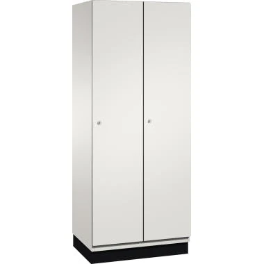 C+P Umkleidespind 4510022S10052 Sockel 2Abteile B800mm lgr/vgn. Korpus elektrolytisch verzinkt und lackiert in hochwertiger Einbrennbeschichtung. Geschlossene Seitenprofile mit ca. 54 Grad Innenschrägen für hohe Stabilität sowie für leichte Innenreinigung und komfortable Entnahme von Kleidung und Taschen. Innen je Abteil 1 Ablageboden mit hinteren Lüftungsfreiräumen und Aufkantung als praktische Abrollsicherung, darunter 1 stabile Garderobenstange aus Ovalprofil mit 4 verdrehsicheren Schiebehaken. Schrankboden hinten sowie Rückwand oben und unten mit großflächigem Luftdurchlass und Wandabstandshaltern für optimale Luftzirkulation. Stahltüren elektrolytisch verzinkt und lackiert in hochwertiger Einbrennbeschichtung, mit Anschlagsdämpfer und geschlossenen Seitenprofilen für höchste Stabilität und Einbruchsicherheit. Türaufhängung mit robusten Aluminium-Druckguss/Kunststoff-Scharnier. Auf 100 mm hohem Sockel mit integrierter Niveauregulierung, bequem von innen verstellbar, vorne zurückgesetzt und oberhalb mit Luftdurchlass.