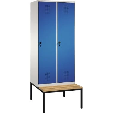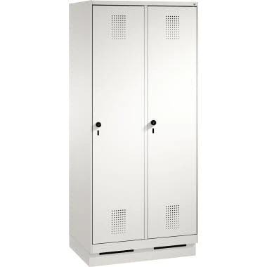 C+P Umkleidespind 4510022S10053 Sockel 2Abteile B800mm lgr/ebl. Korpus elektrolytisch verzinkt und lackiert in hochwertiger Einbrennbeschichtung. Geschlossene Seitenprofile mit ca. 54 Grad Innenschrägen für hohe Stabilität sowie für leichte Innenreinigung und komfortable Entnahme von Kleidung und Taschen. Innen je Abteil 1 Ablageboden mit hinteren Lüftungsfreiräumen und Aufkantung als praktische Abrollsicherung, darunter 1 stabile Garderobenstange aus Ovalprofil mit 4 verdrehsicheren Schiebehaken. Schrankboden hinten sowie Rückwand oben und unten mit großflächigem Luftdurchlass und Wandabstandshaltern für optimale Luftzirkulation. Stahltüren elektrolytisch verzinkt und lackiert in hochwertiger Einbrennbeschichtung, mit Anschlagsdämpfer und geschlossenen Seitenprofilen für höchste Stabilität und Einbruchsicherheit. Türaufhängung mit robusten Aluminium-Druckguss/Kunststoff-Scharnier. Auf 100 mm hohem Sockel mit integrierter Niveauregulierung, bequem von innen verstellbar, vorne zurückgesetzt und oberhalb mit Luftdurchlass.