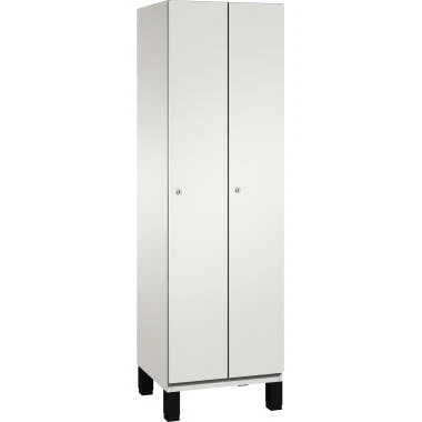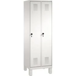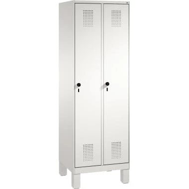 C+P Umkleidespind 4901020S10012 Füße 2Abteile lgr/lgr. Korpus mit eleganten, schmalen Seiten für homogene Optik bei Reihenaufstellung. Geschlossene Seitenprofile mit ca. 54 Grad Innenschrägen für hohe Stabilität sowie für leichte Innenreinigung und komfortable Entnahme von Kleidung und Taschen. Innen je Abteil 1 Ablageboden mit hinteren Lüftungsfreiräumen und Aufkantung als praktische Abrollsicherung, darunter 1 stabile Garderobenstange aus Ovalprofil mit 3 verdrehsicheren Schiebehaken. Schrankboden hinten mit großflächigem Luftdurchlass für optimale Luftzirkulation. Auf 150 mm hohen Füßen aus Kunststoff für optimalen Korrosionsschutz. Mit integrierter Niveauregulierung und Schutzhülsen zur stilvollen Abdeckung der Verstellschrauben, bequem von innen und außen verstellbar. 2 x Ergonomischer Sicherheits-Drehriegel für Vorhangschloss, Stahltüren mit Anschlagsdämpfer und geschlossenen Seitenprofilen für höchste Stabilität und Einbruchsicherheit. Mit reinigungsfreundlichem Belüftungslochbild und eingeprägtem Etikettenrahmen. Türaufhängung oben und unten in Drehbolzen.