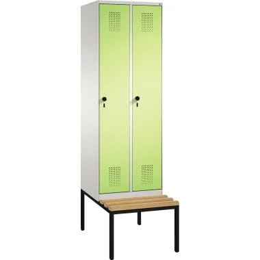 C+P Umkleidespind 4903020S10000 Sitzbank 2Abteile B600mm lgr/lgr. Korpus mit eleganten, schmalen Seiten für homogene Optik bei Reihenaufstellung, geschlossene Seitenprofile mit ca. 54 Grad Innenschrägen für hohe Stabilität sowie für leichte Innenreinigung und komfortable Entnahme von Kleidung und Taschen. Innen je Abteil 1 Ablageboden mit hinteren Lüftungsfreiräumen und Aufkantung als praktische Abrollsicherung, darunter 1 stabile Garderobenstange aus Ovalprofil mit 3 verdrehsicheren Schiebehaken. Schrankboden hinten mit großflächigem Luftdurchlass für optimale Luftzirkulation, auf 150 mm hohen Füßen aus Kunststoff für optimalen Korrosionsschutz. Mit integrierter Niveauregulierung und Schutzhülsen zur stilvollen Abdeckung der Verstellschrauben, bequem von innen und außen verstellbar. Gestell aus stabilem Vierkant-Stahlrohr 30 x 30 mm, mit verstellbaren Bodengleitern für einfachen Niveauausgleich. Sitzleisten aus Buche-Hartholz, im Profil ca. 60 x 30 mm, allseitig gehobelt, oben abgerundet für guten Sitzkomfort. 2 ergonomische Sicherheits-Drehriegel für Vorhangschloss. Stahltüren mit Anschlagsdämpfer und geschlossenen Seitenprofilen für höchste Stabilität und Einbruchsicherheit. Mit reinigungsfreundlichem Belüftungslochbild und eingeprägtem Etikettenrahmen. Türaufhängung oben und unten in Drehbolzen.