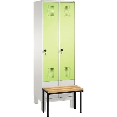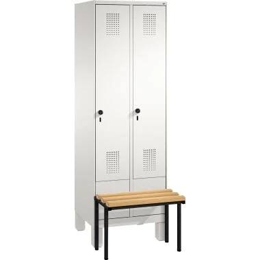 C+P Umkleidespind 4903020S10017 Sitzbank 2Abteile B600mm lgr/vgn. Korpus mit eleganten, schmalen Seiten für homogene Optik bei Reihenaufstellung, geschlossene Seitenprofile mit ca. 54 Grad Innenschrägen für hohe Stabilität sowie für leichte Innenreinigung und komfortable Entnahme von Kleidung und Taschen. Innen je Abteil 1 Ablageboden mit hinteren Lüftungsfreiräumen und Aufkantung als praktische Abrollsicherung, darunter 1 stabile Garderobenstange aus Ovalprofil mit 3 verdrehsicheren Schiebehaken. Schrankboden hinten mit großflächigem Luftdurchlass für optimale Luftzirkulation, auf 150 mm hohen Füßen aus Kunststoff für optimalen Korrosionsschutz. Mit integrierter Niveauregulierung und Schutzhülsen zur stilvollen Abdeckung der Verstellschrauben, bequem von innen und außen verstellbar. Gestell aus stabilem Vierkant-Stahlrohr 30 x 30 mm, mit verstellbaren Bodengleitern für einfachen Niveauausgleich. Sitzleisten aus Buche-Hartholz, im Profil ca. 60 x 30 mm, allseitig gehobelt, oben abgerundet für guten Sitzkomfort. 2 ergonomische Sicherheits-Drehriegel für Vorhangschloss. Stahltüren mit Anschlagsdämpfer und geschlossenen Seitenprofilen für höchste Stabilität und Einbruchsicherheit. Mit reinigungsfreundlichem Belüftungslochbild und eingeprägtem Etikettenrahmen. Türaufhängung oben und unten in Drehbolzen.