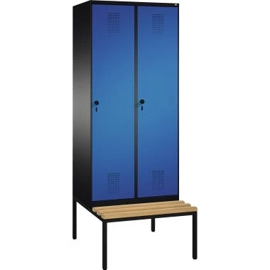 C+P Umkleidespind 4903022S10022 Sitzbank 2Abteile B800mm sgr/ebl. Korpus mit eleganten, schmalen Seiten für homogene Optik bei Reihenaufstellung, geschlossene Seitenprofile mit ca. 54 Grad Innenschrägen für hohe Stabilität sowie für leichte Innenreinigung und komfortable Entnahme von Kleidung und Taschen. Innen je Abteil 1 Ablageboden mit hinteren Lüftungsfreiräumen und Aufkantung als praktische Abrollsicherung, darunter 1 stabile Garderobenstange aus Ovalprofil mit 3 verdrehsicheren Schiebehaken. Schrankboden hinten mit großflächigem Luftdurchlass für optimale Luftzirkulation, auf 150 mm hohen Füßen aus Kunststoff für optimalen Korrosionsschutz. Mit integrierter Niveauregulierung und Schutzhülsen zur stilvollen Abdeckung der Verstellschrauben, bequem von innen und außen verstellbar. Gestell aus stabilem Vierkant-Stahlrohr 30 x 30 mm, mit verstellbaren Bodengleitern für einfachen Niveauausgleich. Sitzleisten aus Buche-Hartholz, im Profil ca. 60 x 30 mm, allseitig gehobelt, oben abgerundet für guten Sitzkomfort. 2 ergonomische Sicherheits-Drehriegel für Vorhangschloss. Stahltüren mit Anschlagsdämpfer und geschlossenen Seitenprofilen für höchste Stabilität und Einbruchsicherheit. Mit reinigungsfreundlichem Belüftungslochbild und eingeprägtem Etikettenrahmen. Türaufhängung oben und unten in Drehbolzen.