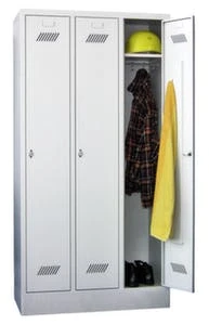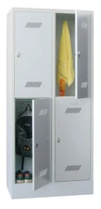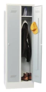 Doppelstöckiger Garderobenschrank, Höhe x Breite x Tiefe 1800 x 610 x 500 mm, 2 x 2 Abteile, Abteil Breite 300 mm, Abteil je mit 1 Kleiderstange mit 3 Haken, Flügeltür mit Lochbild, zusätzlich mit Etikettrahmen, verschließbar mit Drehriegelverschluss für Vorhängeschloss, Unterbau Sockel, Stahlkonstruktion, Korpus mit Pulverbeschichtung in RAL7035 Lichtgrau, Front mit Pulverbeschichtung in RAL7035 Lichtgrau.