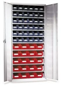 Schrank mit Kästen, Höhe x Breite x Tiefe 830 x 700 x 300 mm, Stahlkonstruktion, verschweißt, Doppel-Flügeltür, Türen mit hoher Stabilität durch innen liegendes Kastenprofil, 6 Ebene(n) mit Stahlboden, Traglast je Ebene 50 kg, im Raster von 10 mm verstellbar, 42 Kästen, 42 x H x B x T 75 x 103 x 160 mm, Kästen aus Polypropylen, Kästen in blau, mit Muldengriff, verschließbar mit Zylinderschloss, 3-riegeliger-Schließmechanismus, Korpus mit Lackierung in RAL7035 Lichtgrau, Front mit Lackierung in RAL7035 Lichtgrau, Ebenen verzinkt, GS- und TÜV-geprüft.